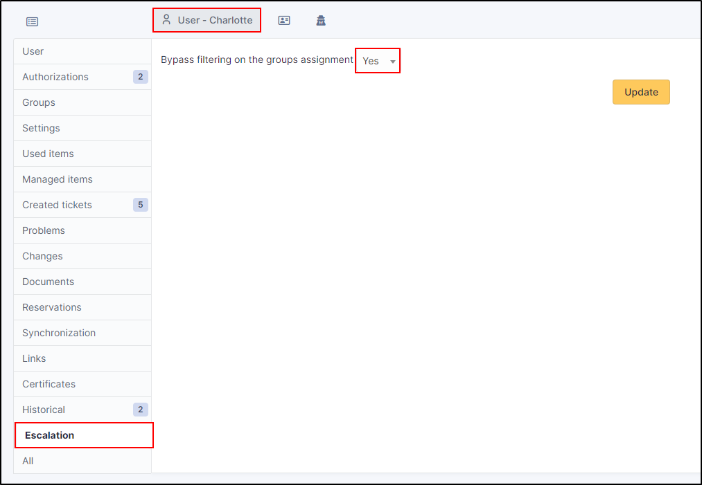 This option can be useful, but it requires all groups to be set up. If, for example, the technician N1 group can escalate tickets to the technician N2 group, you need to ensure that the technician N2 group can escalate tickets to the technician N3 group and also to the N1 group, so that a ticket can be escalated if necessary.