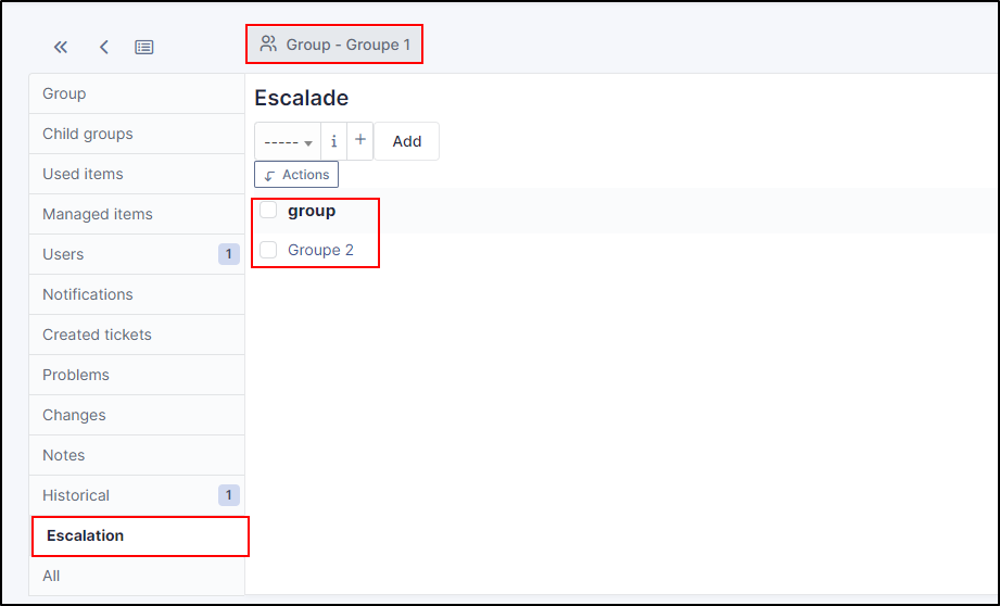 Groupe 1 is configured to allow ticket escalation only to Groupe 2