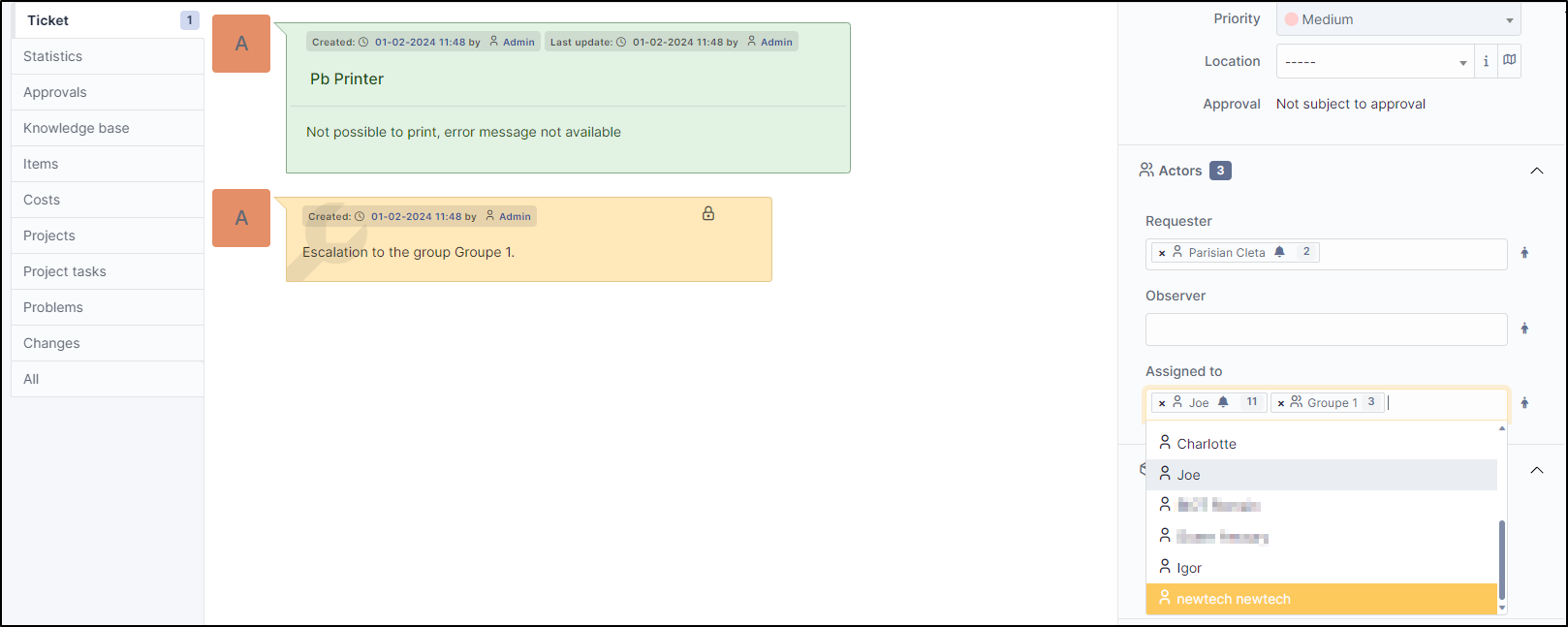 For other users not assign to Groupe 1, they can’t reassign group to ticket (groups are not proposed in the list of assignation)