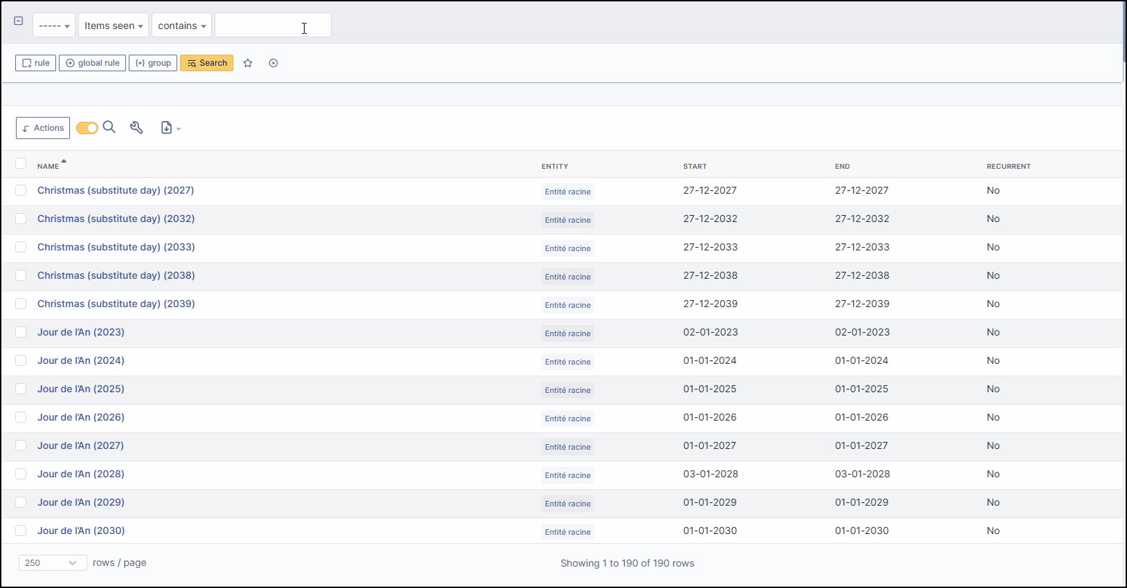 The list of days appears. Let’s assume that the company considers that Easter Monday is not a day off.