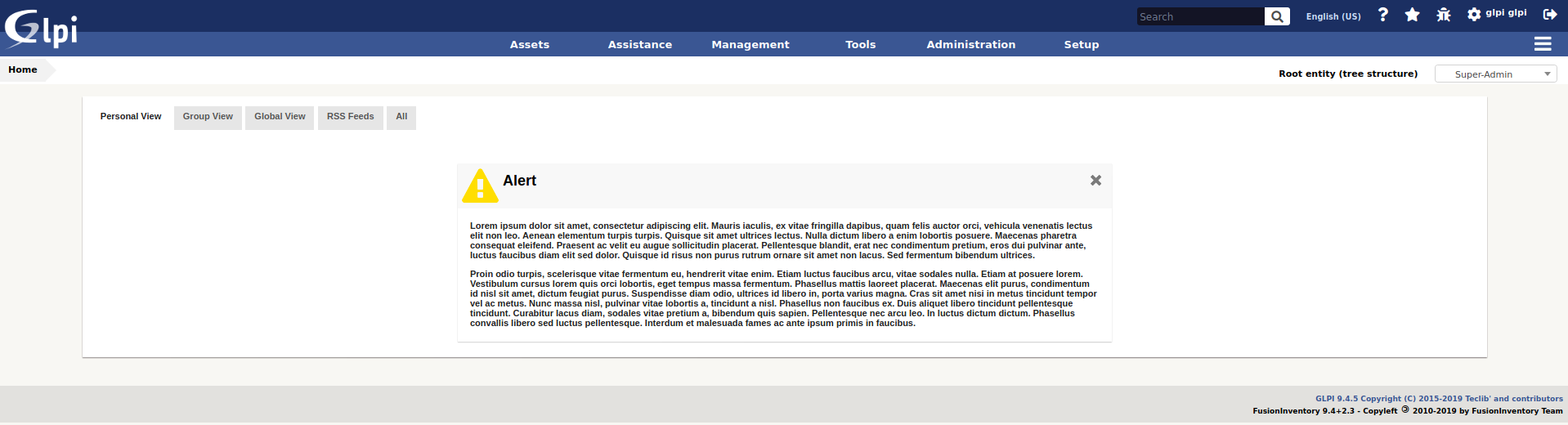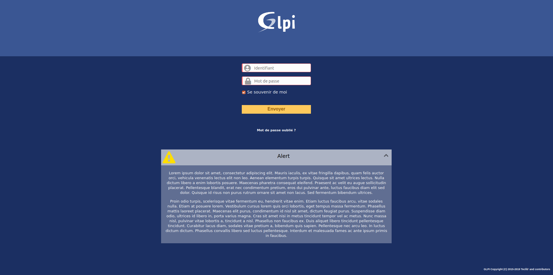 This plugin allows to display alerts messages on GLPI homepage and / or login page.