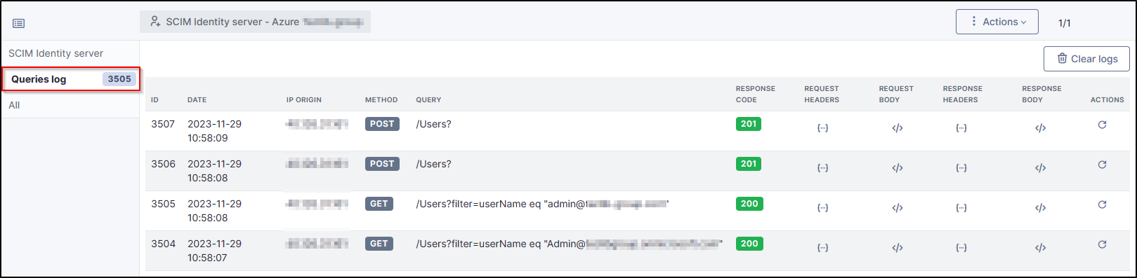 On the GLPI side, Go to the Request log section of your SCIM plugin Setup > SCIM identity servers to check that the accounts are correctly synchronised.