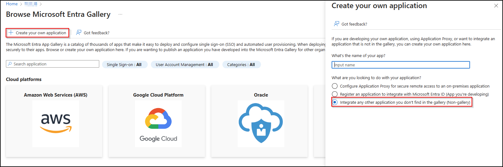 In the section that appears on the right, enter the name of your application and choose the 3rd option `integrate any other application don’t find in the gallery`.